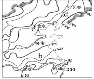 资料:降水变率是表示降水量变动程度的统计量,一般可分为绝对变率和相对变率。降水绝对变率是指某地实际降水量与同期多年平均降水量之差。降水绝对变率与多年平均降水量的百分比,称为降水相对变率。下图是我国部分地区多年平均等降水量线图,图中abcd四城市在某年降水量分别是 1083mm 、986mm 、679mm、642mm。读资料和图回答25-26题。