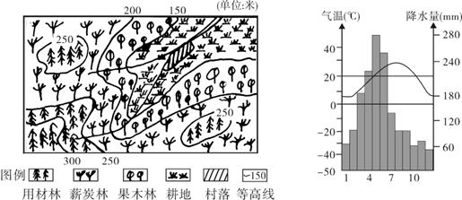 (2)图中河流的流向为__________,其中果木林的分布特征是__________________。(4分)