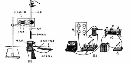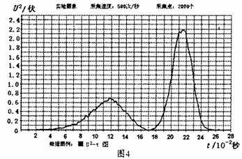 (2)按图l所示装置安装实验器材后,将质量为0.50kg蝇的条形磁铁拖一条纸带由静止释放,利用打点计时器打出如图3所示的纸带。磁铁下落过程中穿过空心的螺线管,螺线管与10Ω的电阻丝接成闭合电路,用电压传感器采集数据得到电阻两端电压与时间的U – t 图,并转换为U 2– t,如图4所示。