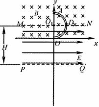 如图所示,在y≥0的区域内存在垂直于坐标平面向里的匀强磁场,磁感应强度大小为B;水平虚线MN、PQ区域内有水平向右电场强度的大小的匀强电场。半径为R的光滑绝缘空心半圆细管AD0固定在竖直平面内,圆心O,在MN上,直径AO垂直于MN。一质量为m、电荷量为q的带正电小球(可视为质点)从半圆管的A点由静止滑人管内,重力加速度为g。求: