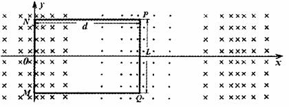 最大值为B0,其空间变化周期为2d,整个磁场以速度v1沿ox方向向前高速平移,由于列车沿Ox方向匀速行驶速度v2与磁场平移速度不同,而且v1>v2,列车相对磁场以v1- v2的速度向后移动切割磁感线,金属框中会产生感应电流,该电流受到的向前安培力即为列车向前行驶的驱动力。设金属框电阻为R,长PQ=L,宽NP=d,求:
