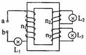 21、L1、L2、L3为三只完全相同的灯泡,按如图所示方式接入一理想变压器。己知匝数比n1:n2=3:1,当a、b接入交流电路时,L2和L3的实际功率为P,此时L1的实际功率P1为___________。^