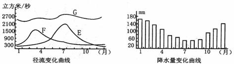 材料二 不同地点测得的径流变化曲线图和E点以上流域的降水量变化曲线图
