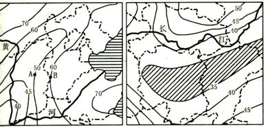 下图中甲乙两图为我国两地河川夏季(6-8月)平均径流量占年平均径流总量百分比图,其中百分比较大的是哪个图示地区,较小的是哪个图示地区?原因是什么?