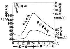 (1)假设暴雨发生时,该河谷的森林早已被砍伐,试在图中绘出可能出现的河流流量曲线和含沙量曲线。