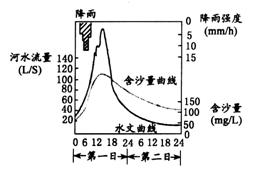 (若题目为森林植被覆盖较差的河谷在暴雨中呈现的河流流量曲线及含沙量曲线图(下左图),请绘制植林成功后的流量曲线及含沙量曲线,答案为右图。)