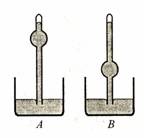 21.(07天津)A、B两装置,均由一支一端封闭、一端开口且带有玻璃泡的管状容器和水银槽组成,除玻璃泡在管上的位置不同外,其他条件都相同。将两管抽成真空后,开口向下竖直插人水银槽中(插入过程没有空气进入管内),水银柱上升至图示位置停止。假设这一过程水银与外界没有热交换,则下列说法正确的是
