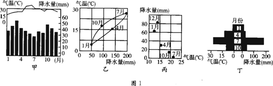 42.下图为气候类型分布模式图,图的左侧是某季节影响气候形成的气压带、风带位置示意图;模式图下方为四地的气候资料图。读图回答下列问题(10分,每空2分)