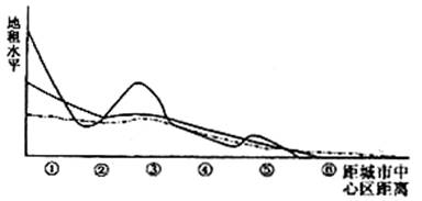 读下面“各类土地利用付租能力随距离递减示意图”,回答6-7题。