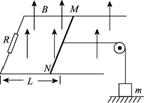 (6分)如图所示,不计电阻的U形导轨水平放置,导轨宽l=0.5m,左端连接阻值为0.4Ω的电阻R,在导轨上垂直于导轨放一电阻为0.1Ω的导体棒MN,并用水平轻绳通过定滑轮吊着质量为m=2.4g的重物,图中L=0.8m,开始重物与水平地面接触并处于静止,整个装置处于竖直向上的匀强磁场中,磁感应强度B0=0.5T,并且