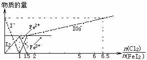13.向FeI2溶液中不断通入Cl2,溶液中I-、I2、IO3-、Fe2+、Fe3+等粒子物质的量随n(Cl2)/n(FeI2)(即Cl2与FeI2的物质的量之比)的变化可用下图简单表示(“-”表示铁各种价态的变化,用“- · -”表示碘各种形态的变化)。