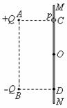 (18分) 如图所示,固定于同一条竖直线上的A、B是两个带等量异种电荷的点电荷,电荷量分别为+Q和-Q,A、B相距为2d。MN是竖直放置的光滑绝缘细杆,另有一个穿过细杆的带电小球p,质量为m、电荷量为+q(可视为点电荷,不影响电场的分布),现将小球p从与点电荷A等高的C处由静止开始释放,小球p向下运动到距C点距离为d的O点时,速度为v。已知MN与AB之间的距离为d,静电力常量为k,重力加速度为g。求: