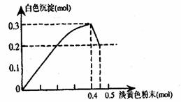 ,加入一种淡黄色粉末状固体时,加热有刺激性气味的混合气体放出,同时生成白色沉淀。当加入0.4mol淡黄色粉末时,产生气体0.3mol,继续加入淡黄色粉末时,产生无刺激性气味的气体,且加入淡黄色粉末时产生白色沉淀的量如下图所示:根据题意同答下列问题: