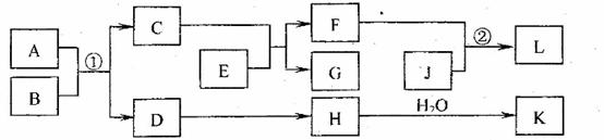 物质A-K的转化关系如下图所示,已知A是由两种元素组成的化合物;B是非金属单质;J是金属单质。H的相对分子质量比D大16(部分反应物、生成物术列出)。