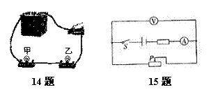 14.如图所示,闭合开关,发现灯泡甲比灯泡乙亮。在该电路中,关于电流、电压、电阻和消耗的电功率大小的判断。正确的是( )
