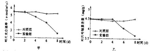 [答案(解析)]D。读懂甲乙两图中2-4天实验组光合作用速率下降但叶片中色素的含量不变;A、明显与图中题意想违背;B、光是光合作用的原料,但植物用于新陈代谢的水比例极小,大多数水都以蒸腾作用散失,所以一般情况下植物不会因缺少水而停止光合作用;C、与图中信息明显违背;D、2-4天色素没有下降,光合作用速率下降,唯一的原因是植物因缺水气孔关闭而缺少二氧化碳,影响了光合作用的碳反应。