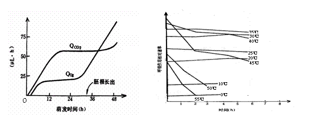 本题中,豌豆吸水暂停后胚根长出前二氧化碳的释放量大于氧气的吸收量,此时以无氧呼吸为主,无氧呼吸在第一阶段有少量能量释放,用于合成ATP;胚根长出一段时间后,氧气的吸收量迅速增加,最后和二氧化碳的释放量相等,有氧呼吸加强到只有有氧呼吸,主要的呼吸方式即有氧呼吸,在线粒体内膜上进行的第三阶段产生大量能量,二氧化碳是在线粒体基质进行的有氧呼吸的第二阶段产生的;温度通过影响酶的活性影响呼吸速率,从图中可见从100C到350C,随温度升高,呼吸速率加快,从350C到550C,随温度升高,呼吸速率下降;要探究15天内不同温度对生长状况一致的豌豆幼苗呼吸作用速率的影响,要保持单一变量,使其他条件相同且适宜