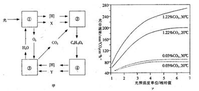 (3)根据图乙判断二氧化碳浓度从0.03%提高到1.22%和温度从20℃提高到30℃哪一变化对光合作用的影响更大的方法是_________,乙图显示对光合速率影响较大的是______。