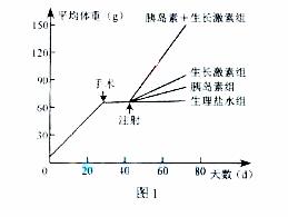 实验一:选取同品种、同日龄的健康大鼠若干只,实施切除手术,一段时间后随机等分成四组,分别注射激素及生理盐水30天,结果如图1。