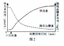 实验二:选取健康大鼠,持续电刺激支配其胰岛的副交感神经,测定血液中胰岛素和胰高血糖素的浓度,结果如图2。