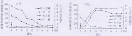 捉出,移人几乎无滨螺的A坑,研究滨螺对海藻及岸蟹种群的影响,结果如图所示。