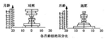 10.(2010 云南部分重点中学模拟)在生态学中,生物和群的年龄结构有两个层次,即个体的年龄组成和组成个体的构件年龄。组成个体构件的年龄是单体生物所没有的。例如一年生苔草的分枝可以月龄画成椎体,下图是施肥对某种苔草的无性系构件月龄结构的影响。请回答: