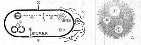 材料1:医学上常使用抗生素治疗由细菌和真菌所引起的疾病。目前常用的抗生素多达几百种。甲图简要表示不同种类的抗生素(①~⑤)对细菌的作用部位或作用原理。