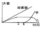 16.(2010安徽省级示范名校联考)用基本培养基对某种细菌进行培养,定时检测细胞数目,并在a、b两时间点分别加入两种营养物质,甲和乙是细胞中两种酶的含量变化曲线,如右图所示。以下判断正确的是
