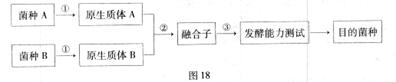 (2010北京海淀区统一练习)酵母菌菌种A能耐高温,但产酒精率较低,而菌种B不耐高温,产酒精率却较高。为获得耐高温、产酒精率高的酵母菌(目的菌种),:进行了如图18所示的实验。清回答下列相关问题。
