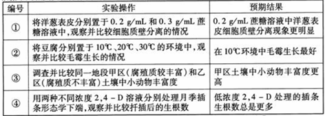 [解析]本题考查了考生对教材实验的理解能力和分析能力。实验(1)中结果应是0.3%溶液中质壁分离明显,实验(2)中毛霉应在20℃环境中生长最好,实验(4)中,如果此时2,4-D浓度低于最适浓度,则浓度再低的话促进生根效果则较差了,所以预期最合理的应是实验(3)即C项正确。