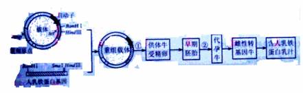 I(1)据图,仅将人乳铁蛋白基因切割出来,需要在人乳铁蛋白基因的左侧用BanHI切割,右侧用HindIII切割。当人乳铁蛋白基因和质粒连接成重组质粒后,TETR基因被人乳铁蛋白基因隔开,不是完整的,而anpR基因是完整的,所以筛选含有重组载体的大肠肝菌首先需要字含氨苄青霉素的培养基上进行。