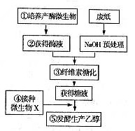 7. (2010东北三校一模)现在大力提倡无纸化办公,但是仍然不可避免的每年要产生大量的废纸,其主要成分是木质纤维,人类正努力将其转化为一种新的资源--乙醇。右图是工业上利用微生物由纤维素生产乙醇的基本工作流程,请回答相关问题: