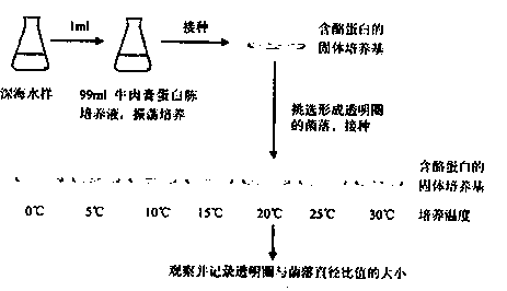 8. (2010·北京市宣武区二检)目前.加酶洗农粉中的蛋白酶主要是中温蛋白酶.最适酶活温度在50℃左右.由于日常洗涤用水的温度达不到该温度.导致蛋白酶括性受到影响。适冷蛋白酶是从适冷鱼类体内分离纯化或由深海适冷菌分泌出来的酶类.最适酶活温度在20℃左右.用其作为洗衣粉添加剂可在较低的温度下达到理想的洗涤效果一下图为分离可分泌蛋白酶的适冷菌的操作步骤.据图回答问题: