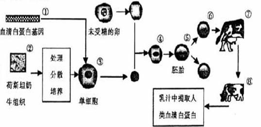 3.(10分)人的血清白蛋白(HAS)在临床上需求量很大,通常从人血中提取。但由于艾滋病病毒等人类感染性病原体造成的威胁与日俱增,使人们对血液制品顾虑重重。如果应用现代生物科学技术,将人的血清白蛋白基因转入奶牛细胞中,那么利用牛的乳汁生产血清白蛋白就会安全、高效地满足人类需求。下图是利用牛奶乳汁生产人类血清白蛋白的图解,根据下图回答: