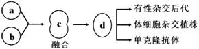 (2)若a、b分别为B淋巴细胞和骨髓瘤细胞,则经融合并筛选得到的d细胞的特点是 ,由d细胞产生的抗体与普通血清抗体相比,具有 的特点。下列是单克隆抗体制备过程的部分图解,请把代表各步骤的字母填写在流程示意图中。