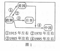 图1为世界汽车产业四次大转移示意图,读图1回答1-2题。