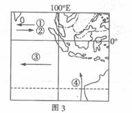 图3中①②分别表示不同季节洋流的流向,读图3回答5-6题。