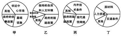 下图甲、乙、丙、丁表示我国四个地区的优势产业形成的要素构成图,据此回答2题。