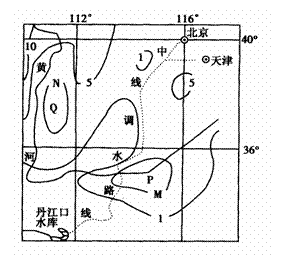 图为南水北调中线沿途地区年沙尘暴等值线分布图,读后回答下面2题。