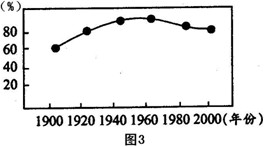 图3为“世界某国上世纪城市人口比重变化过程图”,请回答12-13题。