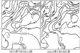 下图是亚洲东部某区域两个时刻的等压线图(单位:百帕),读图回答11-12题。