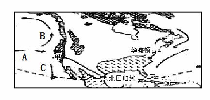 (3)图中A、B、C三支洋流的水温由高到低的排列顺序是________________。其中B洋流对沿岸气候的影响是________________。(4分)