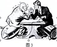 4.(10年全国卷2) 图3是反映古巴导弹危机的漫画。漫画中的两个人物是苏联领 导人赫鲁晓夫(左)与美国总统肯尼迪。从漫画中可以提取的正确历史信息是