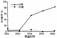(2)[已知每个有虫株上的虫数大致相同,那么据上图可知,从2001-2006年,山坡地的沙棘木蠹蛾种群呈 增长,在 年(区段)该种群的种群增长率最高。