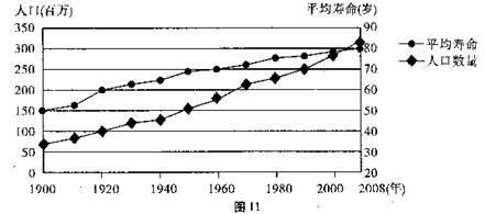 材料一 美国人口增长及人均寿命变化示意图(1900-2008年)。