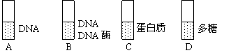 把从S型细菌中提取到的DNA、DNA和DNA酶、蛋白质、多糖,分别与活的R型细菌混合培养,如下图所示。经过培养后进行检查,发现有S型细菌形成的试管是( )