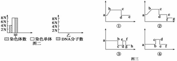 (2)图一中可利用图二甲表示出细胞染色体、染色单体、DNA数目关系的细胞是 ___________________ 。在图二的乙坐标中用柱状图表示A中的染色体数、染色单体数、DNA分子数。(画入上图中)