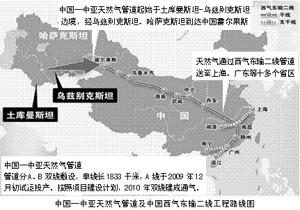 4.(2010上海市嘉定二模)2009年12月12日,中国国家主席胡锦涛和哈萨克斯坦总统纳扎尔巴耶夫共同出席中哈天然气管道竣工仪式,并共同按下管道启动按钮。该管道的竣工通气,标志着中国与中亚能源合作取得重要进展。读图回答问题。