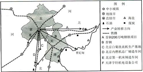 [解析]读图定位这是解答本题的关键,首先确定A地市祁连山地区,这里受地形的影响多地形雨,降水比周边地区多;虚线圆内东部属于黄土高原主要生态问题是水土流失,西部属于内蒙古高原主要生态问题是荒漠化;对于京津唐地区的产业转移要注意读图从图中找出产业转移的特征;对于首钢产业转移的主要影响因素要从转出地北京的环保要求以及转入地的优势进行分析。