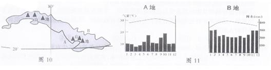 8.(2010年高考桂林市第二次模拟考试文科综合能力测试(地理部分))某岛国(图10)位于加勒比海的北部边缘,其首都是西印度群岛中最大的城市和世界上最美丽的城市之一,有“加勒比海的明珠”之称读图10及图11“该岛气候资料图,”回答下列问题。